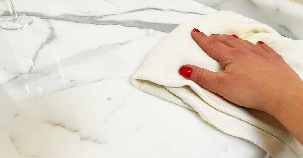 Uno degli errori più comuni è lasciare asciugare il marmo all’aria. Quando l’acqua evapora naturalmente, lascia sulla superficie residui di detersivo e minerali, che si trasformano in aloni ben visibili.