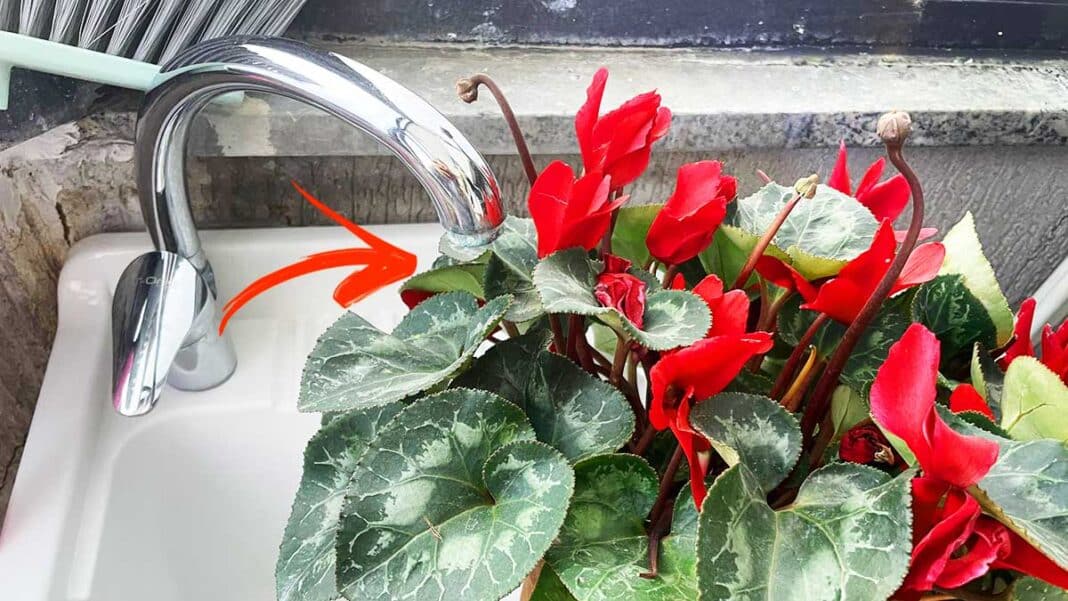Ti basterà riempire una bacinella o un lavandino con 5-6 cm d’acqua e immergerci dentro il ciclamino in modo che l’acqua arrivi circa all’altezza di metà vaso. Attraverso i fori di drenaggio alla base del vaso, il terriccio assorbirà l’acqua di cui ha bisogno. Si parla anche del metodo del lavandino o della bacinella.
